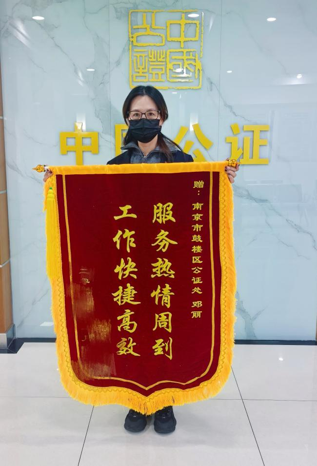 “服务热情周到 工作快捷高效”——贵州的周女士(化名),为提取父亲在南京的存款犯了难。千里之遥、流程不熟,让这趟奔波显得格外沉重。接待她的公证员邓丽立即启动快速响应机制,当天受理、多方核查,并连夜整理好全部材料。次日,周女士的母亲赶到南京,顺利签字、当场领取公证书,当日便办妥取款,安心返程。一面跨越山河的锦旗,传递着“服务零距离”的温暖承诺。“服务热情周到 工作快捷高效”—千里之遥,服务零距离温暖人心。